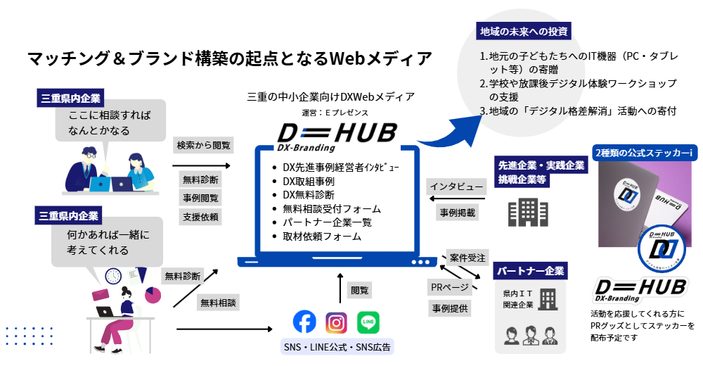 D:HUBは、伴走型のWebコンサルティング会社|株式会社Eプレゼンスが立ち上げた、三重の課題は三重の企業で解決する「新しいDX支援プラットフォーム」です。