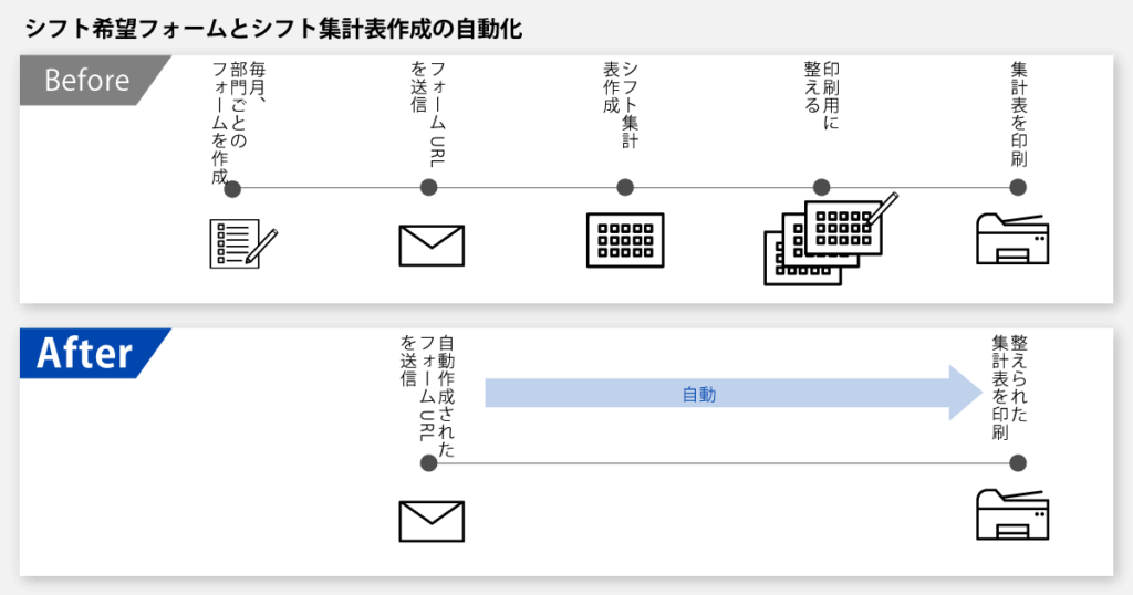 Eプレゼンスさんに50名分の手書きシフトをスマホから入力できるようにしてもらったが、集計作業が手作業で大変だったからなんとかならないか、と相談したのがきっかけです。