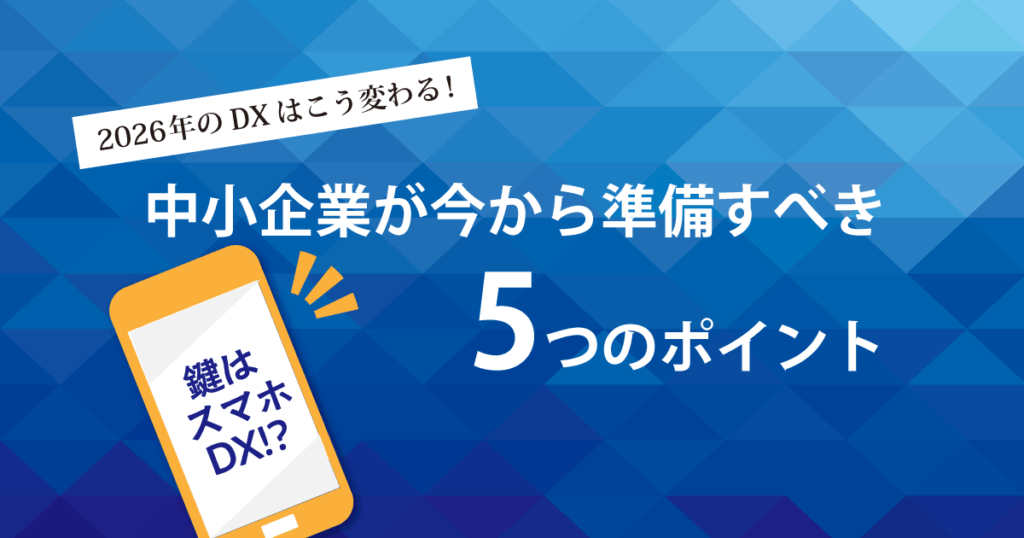 お役立ちコラム 2026年のDXはこう変わる!中小企業が今から準備すべき5つのポイント2026年は、中小企業にとってデジタル活用の重要度がさらに高まる一年になるとみられています。制度 … 【中小企業・小規模事業者向け】失敗しないデジタルツール選び:3つのステップでできる導入準備デジタルツールを導入したのに、「結局使われなくなった…」「現場が定着しなかった…」そんな声は、中 …